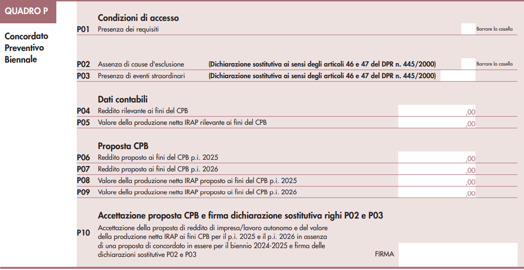 Nel Quadro P si inseriscono poi i dati relativi alle condizioni di accesso, i dati contabili, quelli relativi alla proposta di CPB, e infine l’accettazione del concordato. Le istruzioni riportano tutti i codici da utilizzare per identificare gli eventi straordinari da inserire nel rigo P03.
