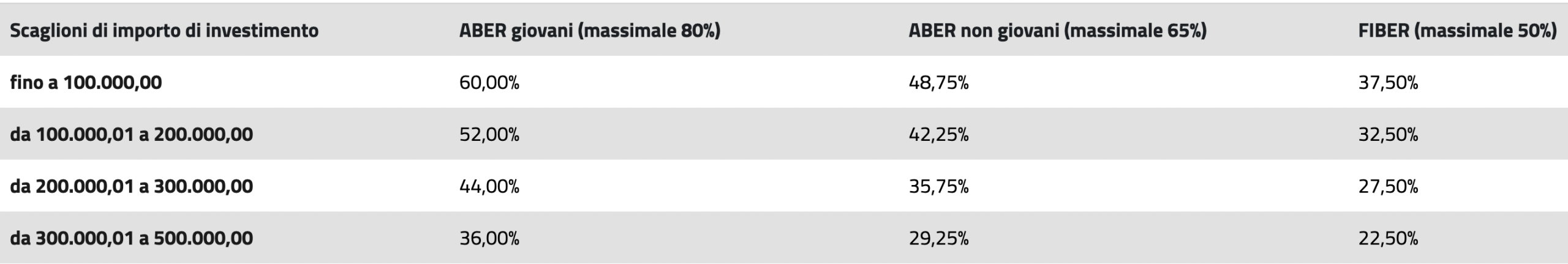 Sono previsti contributi a fondo perduto per l’acquisizione di macchine, strumenti e attrezzature per l’agricoltura, macchine mobili non stradali per agricoltura e zootecnia e trattrici agricole, oltre a investimenti per la pesca e l’acquacoltura. Per le PMI agricole e della pesca che investono nella produzione primaria e nella trasformazione agricola (ABER), nella pesca ed acquacoltura e nella trasformazione ittica (FIBER), il contributo è proporzionale ai costi ammessi secondo la seguente tabella.